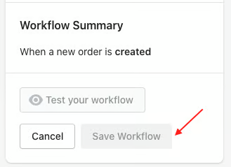 It's worth giving your workflow a name to help you identify it at a later date, so add a workflow name in the New Workflow section, check the summary of your workflow and if happy, either Test your Workflow against an existing order or hit Save Workflow: