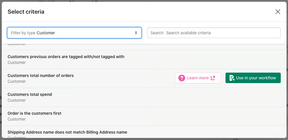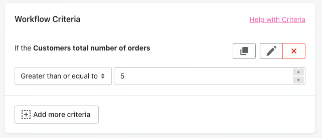 Any new order will now be checked to see if the Customers total number of orders is Greater than or equal to 5. If the workflow matches, the order will be tagged with VIP Customer.