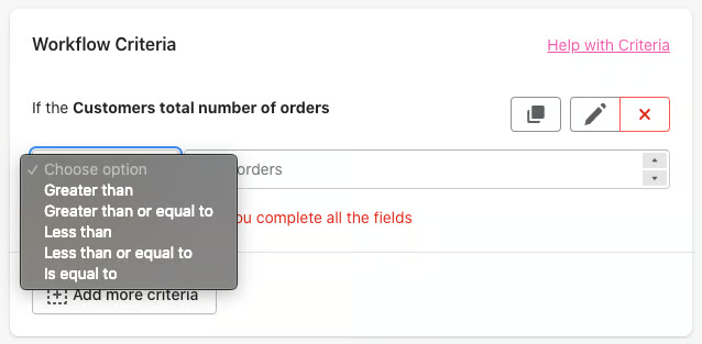 When configuring this criteria, you can choose if you want the criteria to match when the customer's total number orders are: