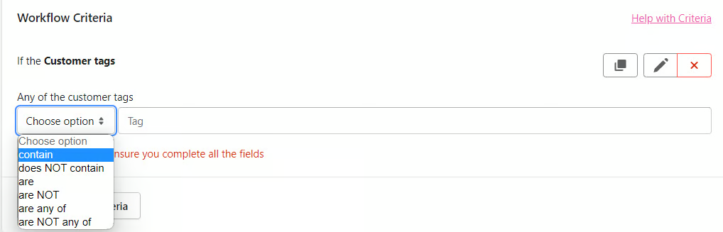 Select a criteria condition based on what you are trying to identify in your Customer tags criteria.
