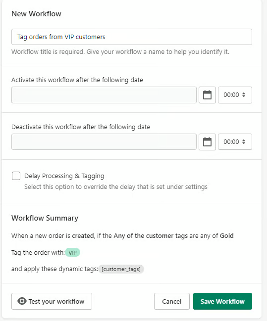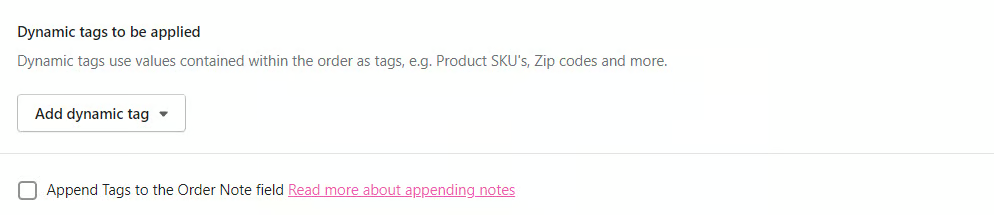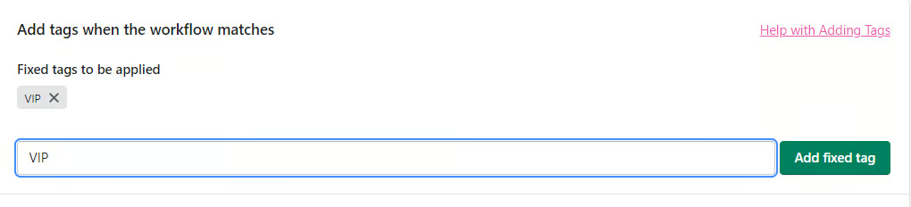Choose the name of the tag you'd like to see on all orders that match this workflow and enter it into the FIXED TAGS TO BE APPLIED option: