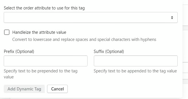 Select a tag prefix or suffix if required and then click on the Add Dynamic Tag button: