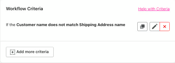 This criteria will compare the first name and last name entered as the billing details against the first name and last name of the shipping address. If they are different, then the workflow will match and any tags you have specified will be applied to the order.
