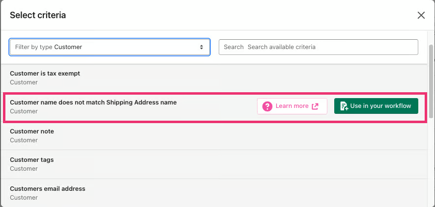 The Customer name does not match the shipping address name criteria can be found within the Customer category in the Select criteria pop-up window: