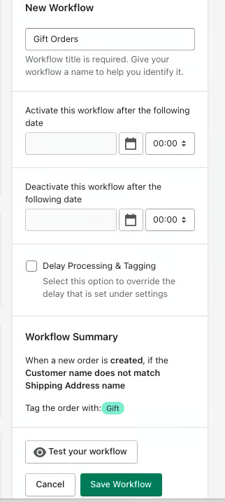 It's worth giving your workflow a name to help you identify it at a later date, so add a workflow name in the New Workflow section, check the summary of your workflow and if happy, either Test your Workflow against an existing order or hit Save Workflow: