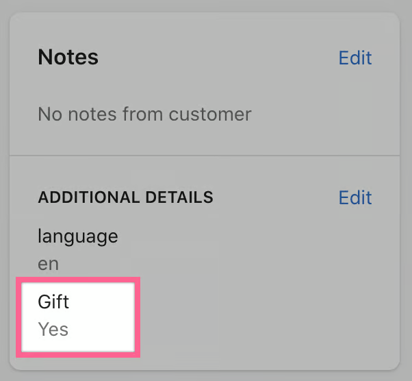 If a customer selects this option before checking out, when the order is placed, the order attribute key:value pairing of Gift:Yes will appear on the right-hand side of the order in Shopify in the Additional Details section: