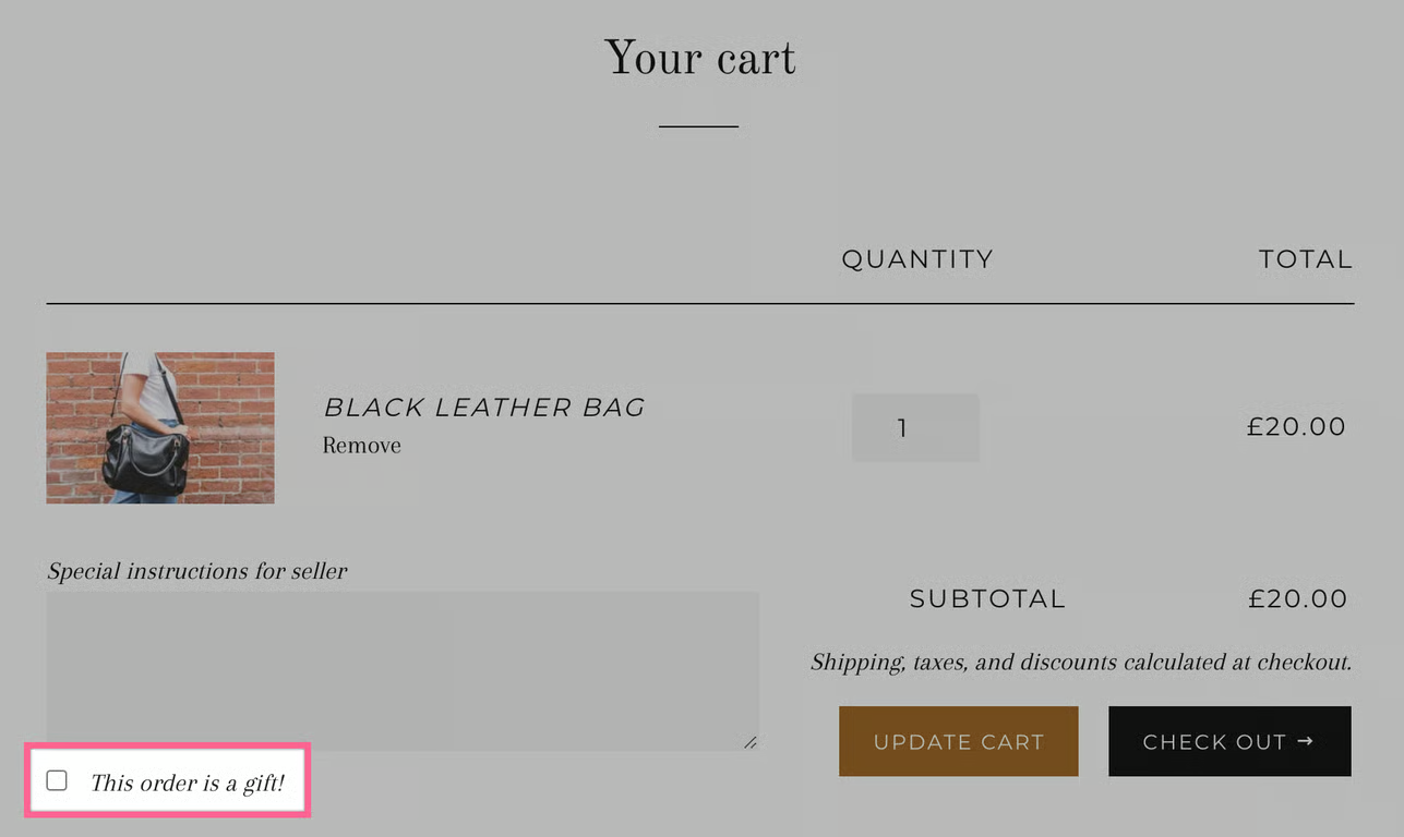 We would prefer that Merchants use a mechanism such as a checkbox on the front-end of their website to allow customers to mark an order as a gift order. This can be done with the addition of some basic code to your theme's cart page (if you use a cart page).