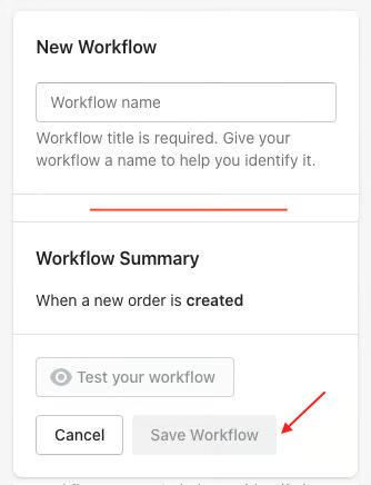 It's worth giving your workflow a name to help you identify it at a later date, so add a workflow name in the New Workflow section, check the summary of your workflow and if happy, either Test your Workflow against an existing order or hit Save Workflow: