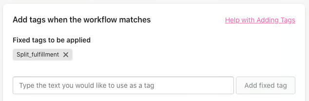 Choose the name of the tag you want to see on all orders that match this workflow and enter it into the Add tags when the workflow matches section. In this example we have used the tag Split_fulfillment: