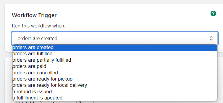 Define the trigger to determine at which point you would like the workflow to run, we recommend selecting the trigger when orders are created.