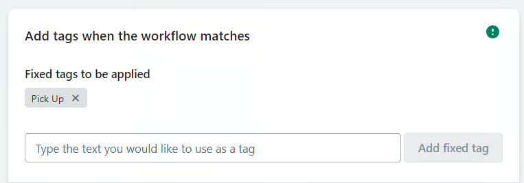 Choose the name of the tag you'd like to see on all orders that match this workflow and enter it into the Add tags when the workflow matches section.